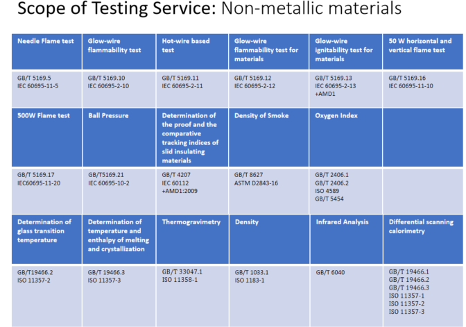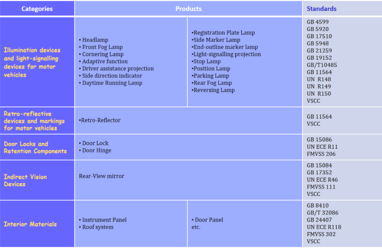 目前,分中心主要业务包括:CCC、CQC、欧盟E-mark认证测试、美标FMVSS测试、台湾VSCC车辆安全测试法规(VSTD)认证测试、韩国标准KMVSS测试、印度标准AIS认证测试、非金属材料测试、纺织品测试等相关认证检测和技术服务。具体认证测试范围如下: